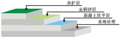 3. 金鋼砂層:先將2/3硬化劑(金屬骨料或非金屬骨料)均勻撒布,讓材料充分吸收混凝土中水份,用抹光機(jī)械抹平;再將余下1/3硬化劑均勻撒布,抹平。當(dāng)混凝土不被破壞時(shí),再抹平,收光;